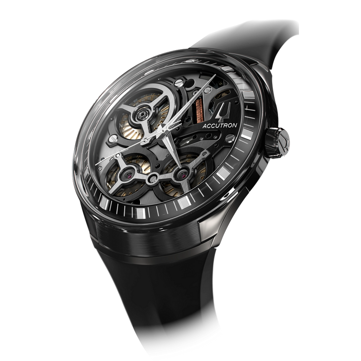 Stainless steel case in combo matte black and muted grey finish with stamped Accutron logo and turbine design on the case back.