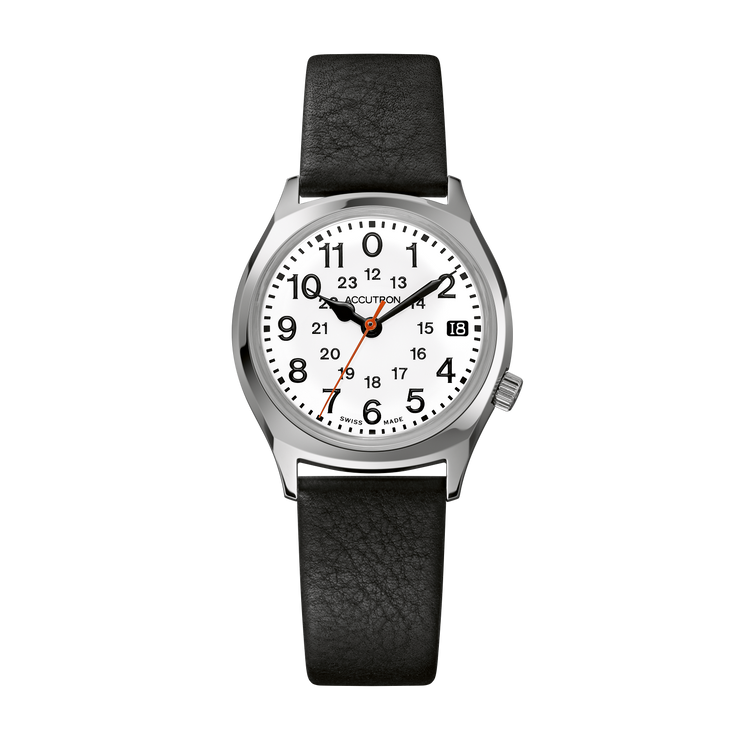 Regular price$1,450.00 Save $-1,450.00The “R.R.-O”, first launched in 1970, has been reimagined as part of the Legacy collection from Accutron. The uniquely faceted stainless steel railroad case design has a crown placement at 4 o’clock, features bold Arabic numerals, a bright white dial, with a 0 at the 12-hour mark to meet Canadian Railroad specs, and a red second hand for accurate monitoring, as well as a calendar feature. The black leather strap completes the classic look, for a bold design that is just as reliable as it is stylish. The Swiss-made 26-jewel movement guarantees reliability.