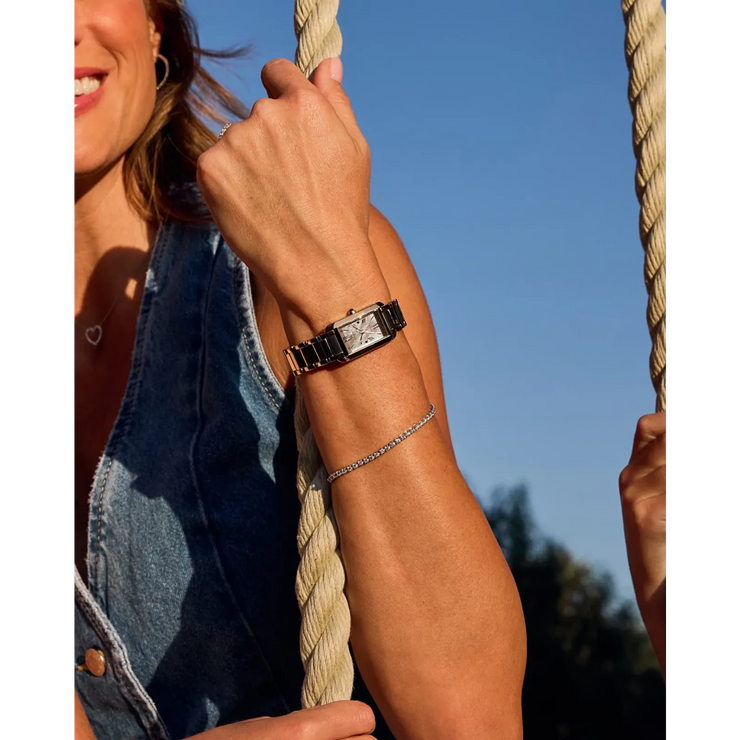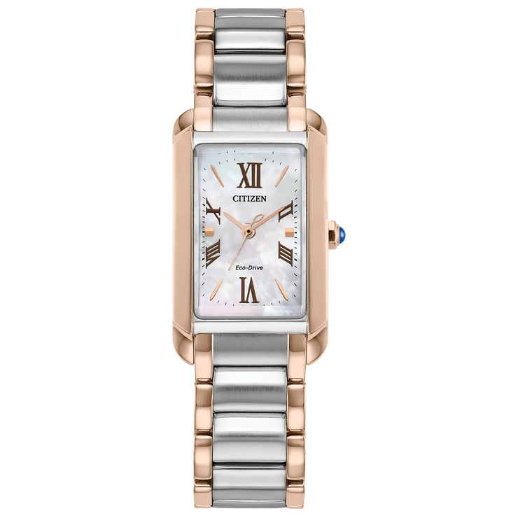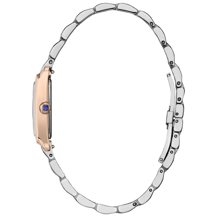 Regular price $450.00 Sale price $360.00 Save $90.00Classic lines and subtle sophistication make this latest piece to our women’s collection, the Citizen L Bianca, a charming addition of sustainable luxury. With a design inspired and celebrating feminine motifs in art deco, the distinctive silver- and rose gold-tone stainless steel timepiece features an elongated case shape and a subtle synthetic sapphire on its crown, creating a captivating look. A curved rectangular shape defines the watch’s 32.4mm silhouette, with a triple link bracelet rounding out the look.