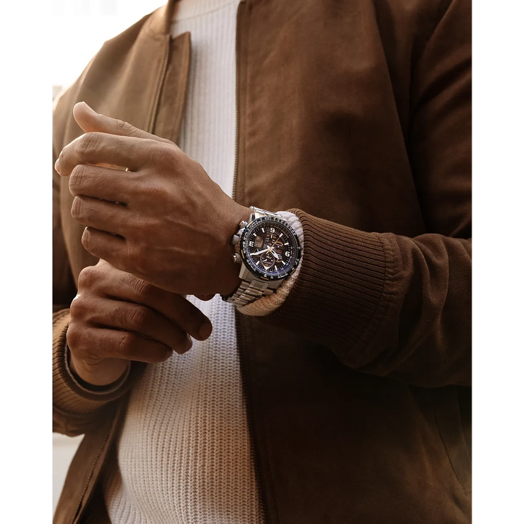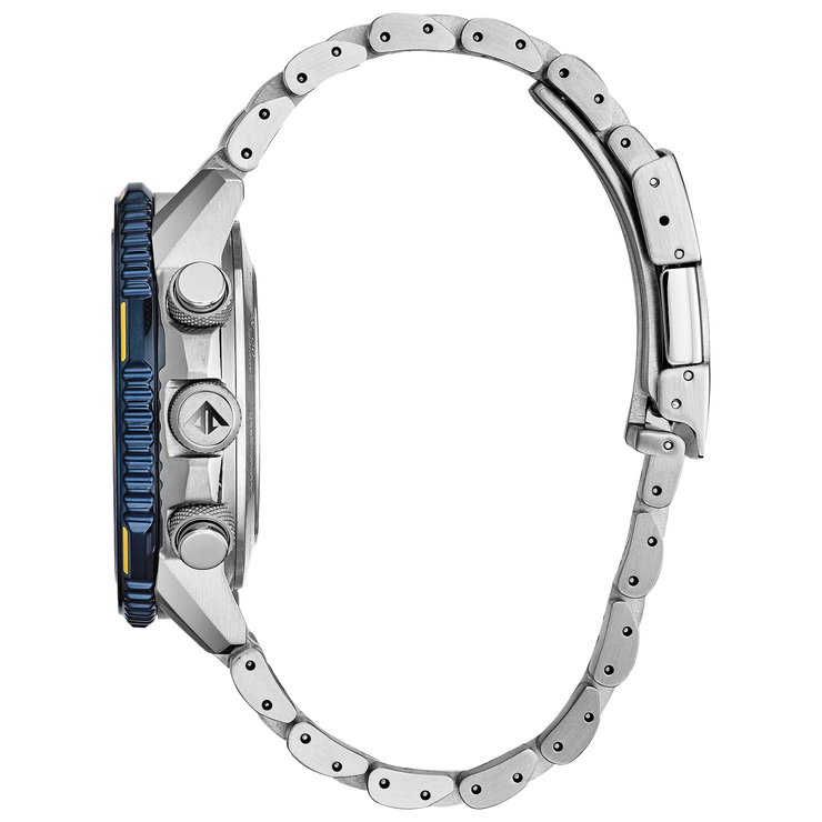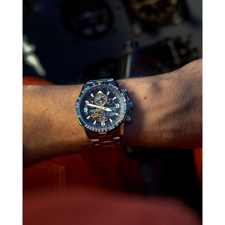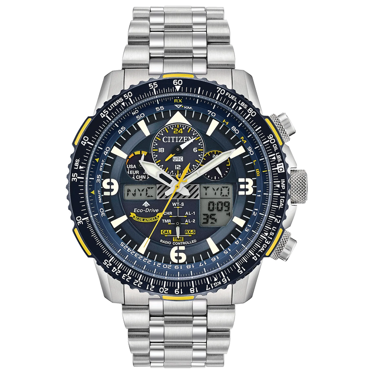 The Blue Angels are the Navy's elite flight demonstration squadron renowned for their precision and grace showcased in each of their flight maneuvers. This precision and grace is exhibited in the CITIZEN Promaster Blue Angels Skyhawk A-T with precise atomic timekeeping in 43 cities. Other features include a chronograph, perpetual calendar, dual time, alarms, countdown timer, digital backlight and UTC display, power reserve and pilot's rotating slide rule bezel. This model appears in a stainless steel case and bracelet, yellow accented dark blue dial and bezel with the Blue Angel's insignia replicated on the caseback. Featuring our Eco-Drive technology – powered by light, any light. Never needs a battery. Caliber number U680.