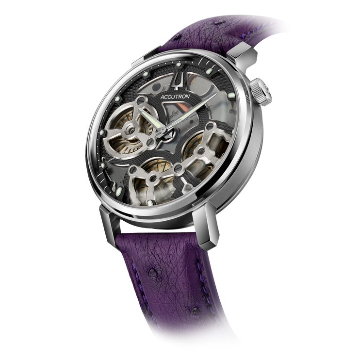 Regular price$4,250.00 Save $-4,250.00Introducing the new Le Kool Spaceview Evolution. Imbued with the essence of funk, this latest addition features a purple ostrich strap with branded black calf lining. Limited Edition of 50. Retaining the iconic and distinctive case of the Spaceview 2020, these new models feature an updated movement orientation shifted by 30 degrees, offering a fresh and innovative look. The turbines are repositioned, and the crown is now located at the two o’clock position. Enhanced bridgework details, including fine knurled finishing ensures a perfect blend of tradition and modernity. Limited Edition of 50.