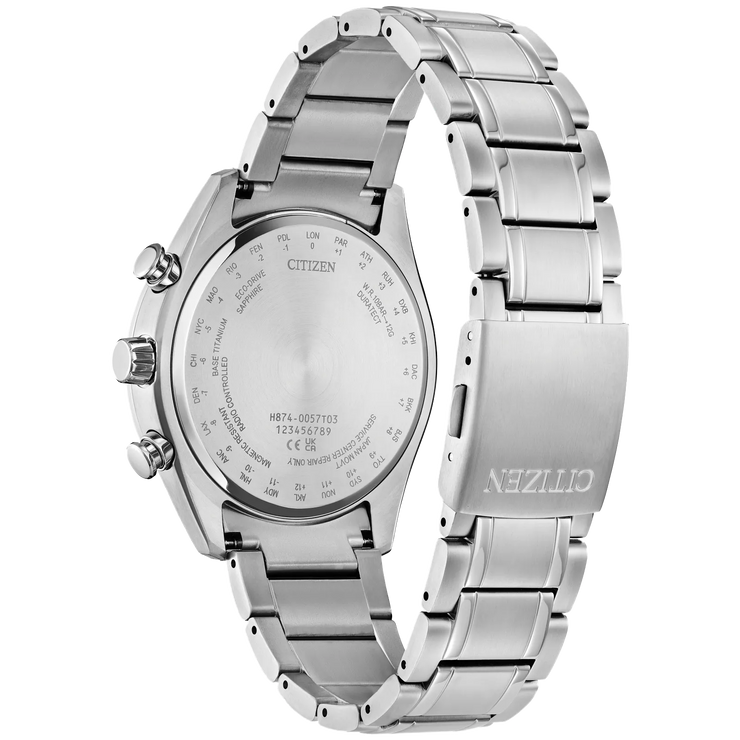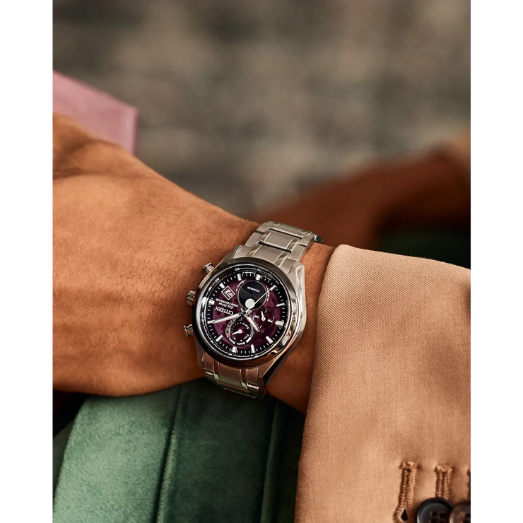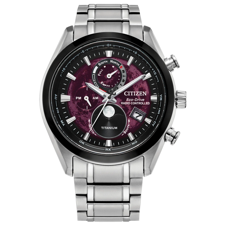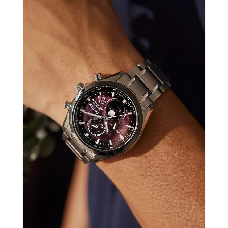 Regular price $875.00 Sale price $700.00 Save $175.00When breakthrough technology and spectacular design meet, the Tsuki-yomi A-T is reading the moon. It’s the world’s first moonphase watch combined with atomic timekeeping innovation from Citizen, and this 30th Anniversary model is nothing short of impressive. The styling embodies the moon’s surface and a window at 6 o’clock displays the current moon phase. The timepiece measures 43mm in a silver-tone Super Titanium™ case, where sharp faceted edges pair with an elevated design throughout for an eye-catching aesthetic on the wrist. The deep red dial works in tandem with black accents and silver-tone touches for a display that’s as handsome as it is legible. In addition to its running time, the watch features a moon phase display, world time in 24 time zones, a perpetual calendar, and a day-date functionality. Powered by Citizen’s proprietary Eco-Drive technology to provide light-powered vitality without ever needing a battery. Water resistant up to 100 meters. Caliber H874.