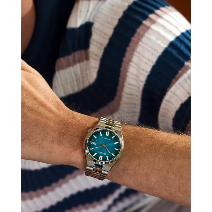 A sleek new timepiece that brings ultramodern sports styling right to your wrist, meet the latest addition to the fan-favorite Citizen TSUYOSA Collection. Executed in a versatile 40mm footprint, the sophisticated design of the watch makes a strong impression via a silver-tone stainless steel case and a seamlessly integrated, matching bracelet. Underneath an anti-reflective sapphire crystal, the sporty timepiece makes use of an eye-catching, gradient teal dial, with a 3 o’clock date window and contrasting silver-tone details adding to its classic aesthetic. Powered by an automatic movement and offering up to 50 meters of water resistance, the refined Citizen TSUYOSA is a serious, daily wearing choice ready for work, play, and everything in between. Caliber 8210.